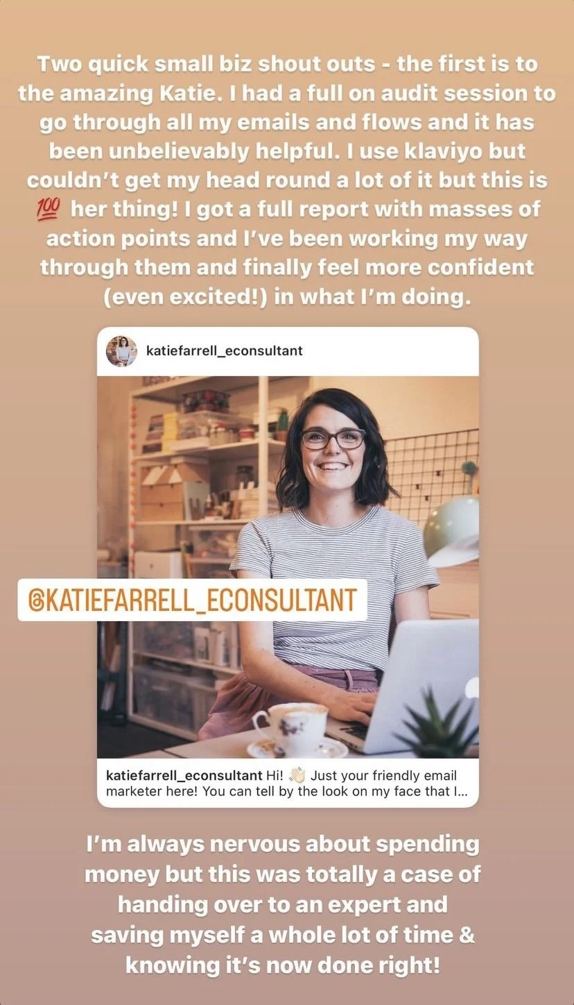 "Katie’s knowledge of Klaviyo and email marketing is incredible. She gave me plenty to think about and fix—and we’re already seeing results."